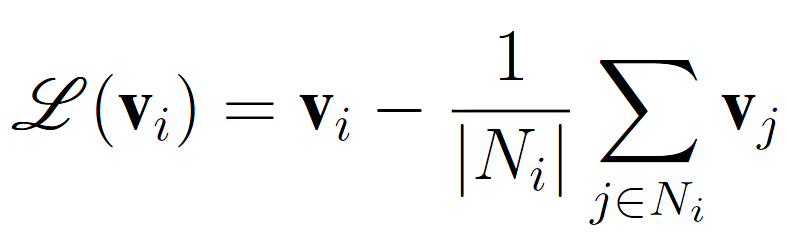 1 2 3 | \begin{equation} \mathscr{L}(\ve v_i) = \ve v_i - \frac{1}{\left| N_i \right|} \sum_{j\in N_i} \ve v_j \end{equation} |