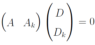 1 2 3 4 5 6 7 8 9 10 | \begin{equation} \begin{pmatrix} A & A_k \end{pmatrix} \begin{pmatrix} D \\ D_k \end{pmatrix} = 0 \end{equation} |