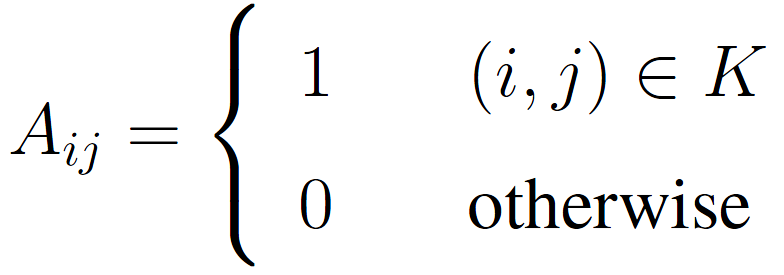 1 2 3 4 5 6 7 8 | \begin{equation} A_{ij} = \left\{ \begin{array}{l l} 1 & \quad (i,j) \in K \\ 0 & \quad \text{otherwise} \\ \end{array} \right \end{equation} |